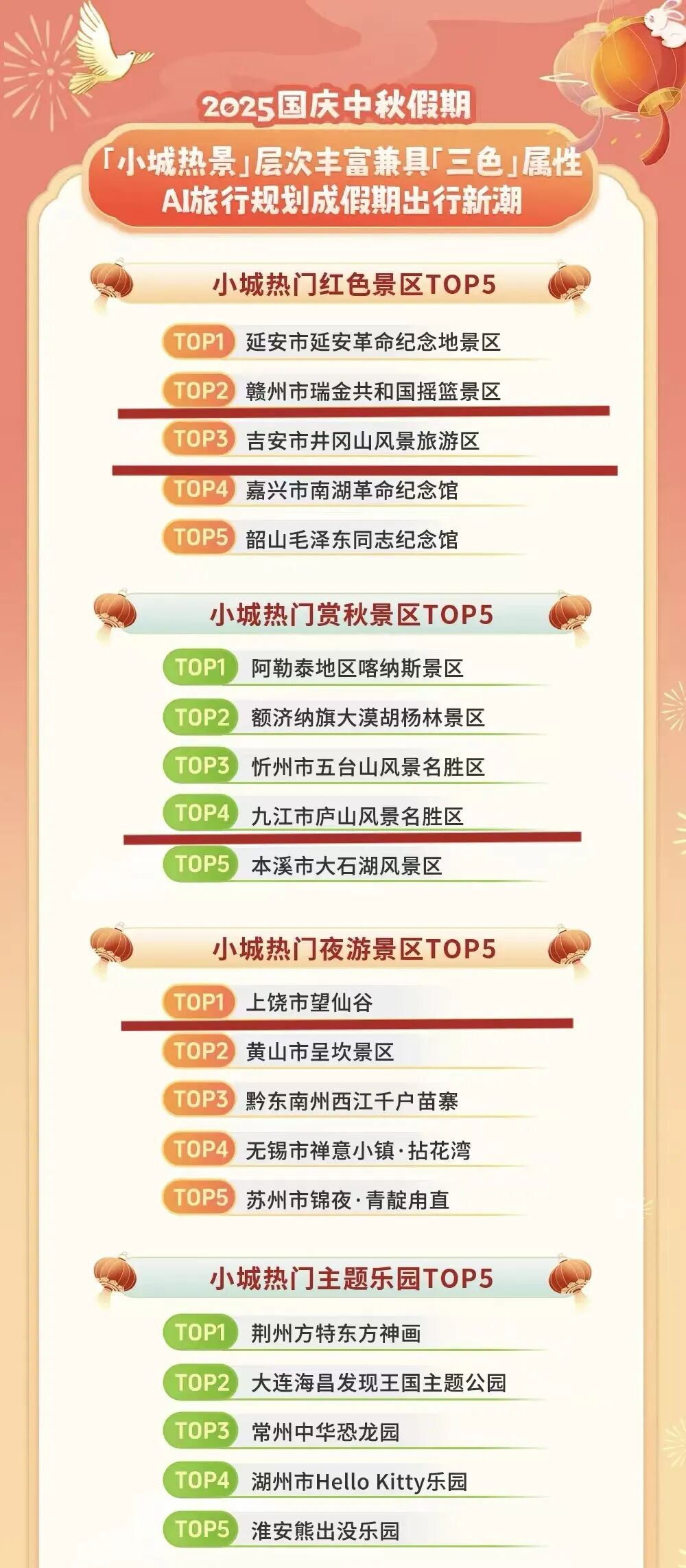 10月8日,同程旅行发布的《2025国庆中秋假期旅行消费报告》传来重磅喜讯:江西省内赣州、吉安、九江、上饶分别跻身“红色、赏秋、夜游等不同主题全国 TOP5”,创下“一省四地”登榜的亮眼纪录!其中,咱吉安的核心文旅地标——井冈山景区,凭借深厚的红色底蕴、秀美的生态风光与丰富的文旅体验,强势代表吉安登上红色主题榜单,成为这个双节里闪耀的“红色名片”。